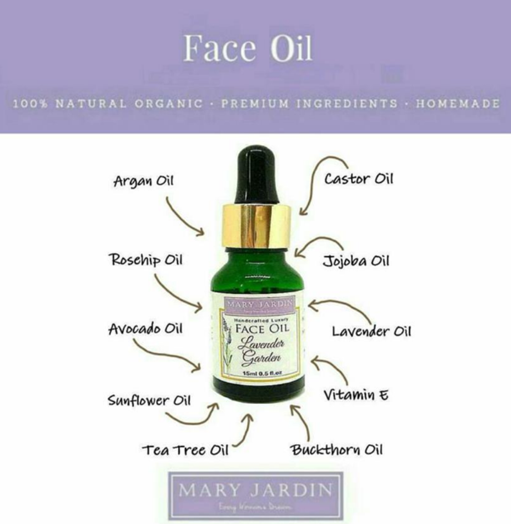 Mary Jardin Handcrafted Luxury Face Oil adalah adunan berkhasiat, diformulasikan dari minyak botani semulajadi 100% untuk menyuburkan kulit kering dan memulihkan cahaya muda. Ia membalikkan kesan kerosakan kulit dan meremajakan beberapa tahun dari kulit anda. Minyak membersihkan jauh ke dalam liang dan membersihkan wajah dari bintik hitam atau whiteheads. Ia mengandungi campuran minyak mewah yang tinggi dalam asid linoleik untuk menjaga jerawat dan menjauhkan pengelupasan kulit. Ia juga mengawal pengeluaran sebum kulit untuk mengelakkannya daripada terlalu kering atau berminyak. Kaya dengan antioksidan dan anti-radang untuk menenangkan kulit sensitif dan ekzema serta meningkatkan keupayaan reparatif fisiologi kulit. Aplikasi biasa meningkatkan nada dan keanjalan kulit, menghasilkan kulit yang kelihatan licin dan berseri. Campuran minyak yang unik ini semuanya indah dan jauh dari berminyak. Ia mudah diserap ke dalam kulit dan meninggalkan kulit anda lembap, lembut dan terhidrasi dengan baik. Mary Jardin Luxury Face Oil membantu anda menentang usia secara semula jadi tanpa pembedahan!